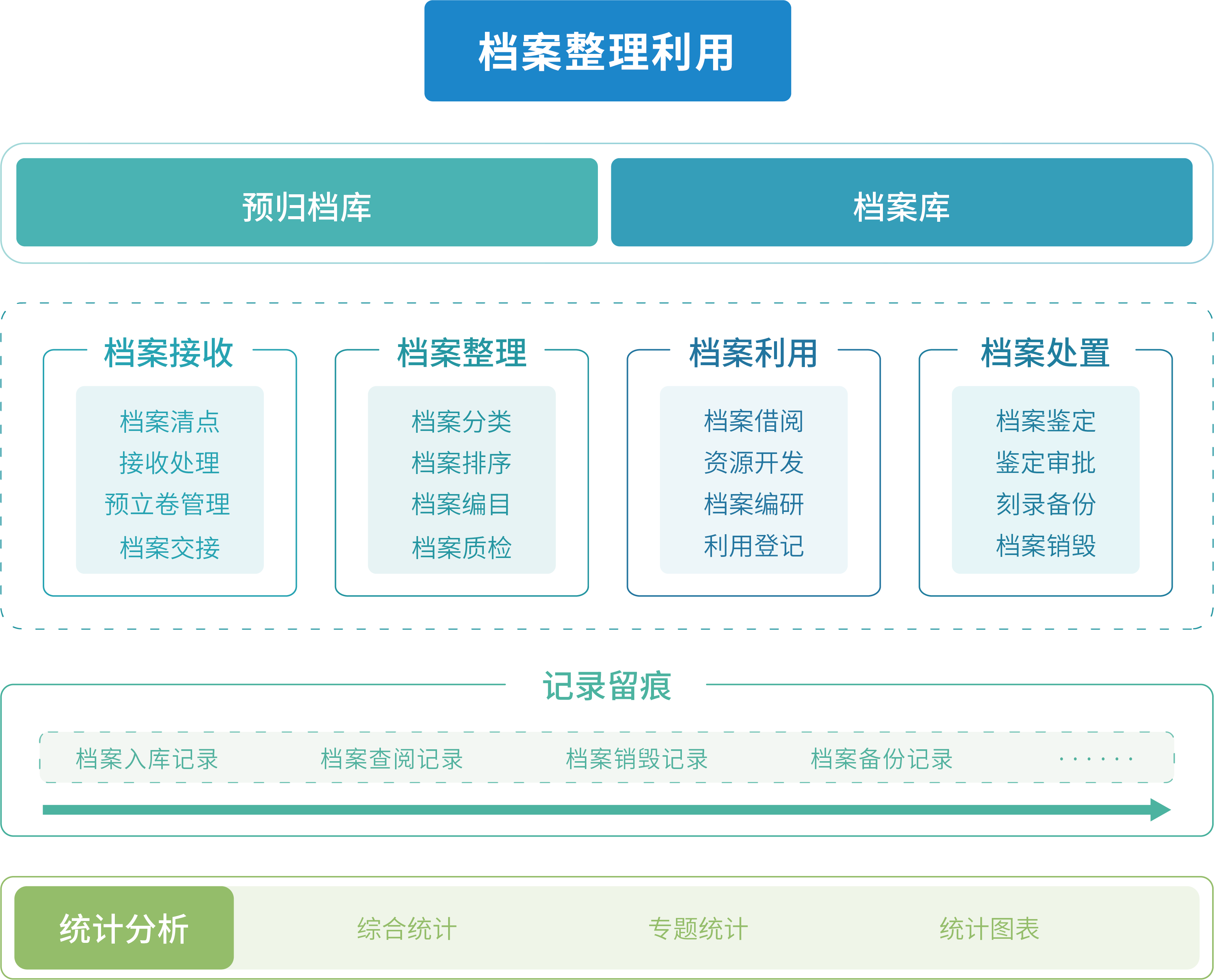综合档案管理系统涵盖档案收、管、用的整个业务流程,能够实现电子档案在线归档和服务利用,包括档案采集、整理、归档、保管、鉴定、发布、检索利用及编硏等全部业务环节,以电子档案为入口,档案资源库为中心,采用信息化等多种技术手段,基于安全、可靠的原则,实现电子档案长期保存利用。以用户需求为导向,为用户提供便捷利用的服务为目标,实现与其他业务系统共享数据进行集成,实现分布式异构数据的集成管理与资源共享,推进实体档案流程化管理和电子档案在线管理的档案业务管理平台。