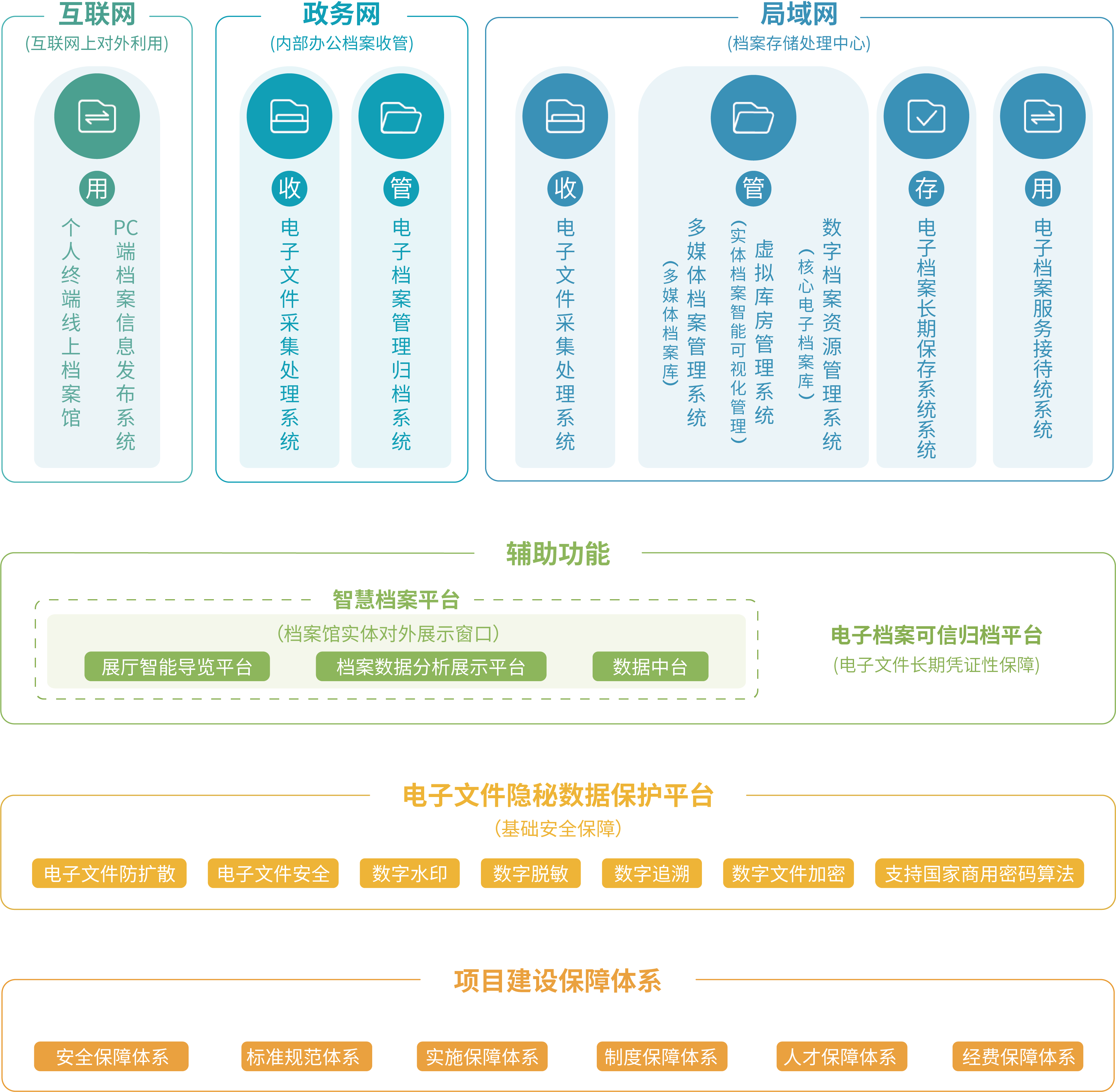 数字档案馆(室)整体解决方案是依据《全国档案事业发展“十三五”规划纲要》、《数字档案室建设指南(档办【2010】116号)》、《国家电子文件管理工作规划(2011-2015年)》、 《电子文件管理系统通用功能要求》(GB/T29194-2012)、《电子文件系统测试规范》(GBT 31021.2-2014)等相关标准规范,对企事业单位的档案进行收集、整理、保管利用等业务全流程管理。